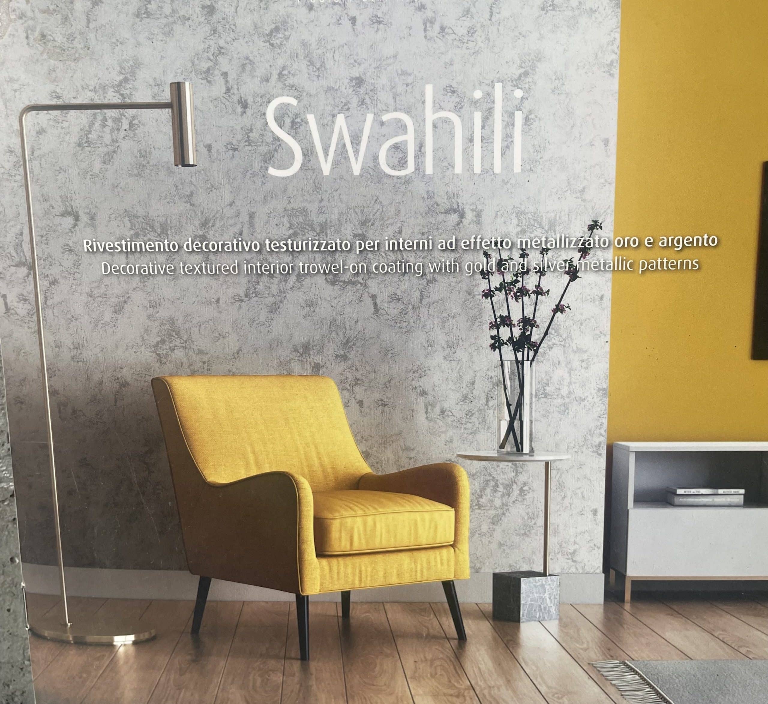 Swahili is a decorative coating for interiors made of metallic charges and selected quartz aggregates that produce high end visual effects and create a unique game of light and shades. Swahili represents the expression of Novacolor commitment to the environmental sustainability. To reduce the “carbon footprint”, Swahili is formulated with a special binder, made from sustainable biomass, that replaces the fossil raw materials. This is possible thanks to a technical-productive system called “mass balance approach” certified REDcert